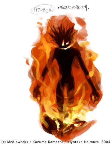 Whatever the case may be, it does ultimately work, and Stiyl totally freaks out over this sudden event. Eventually he's forced to use his trump card, Innocentius, a giant fire titan that is surely badass as hell, like some hype as fuck Summon from Final Fantasy. This is what Haimura's sketches show him as: